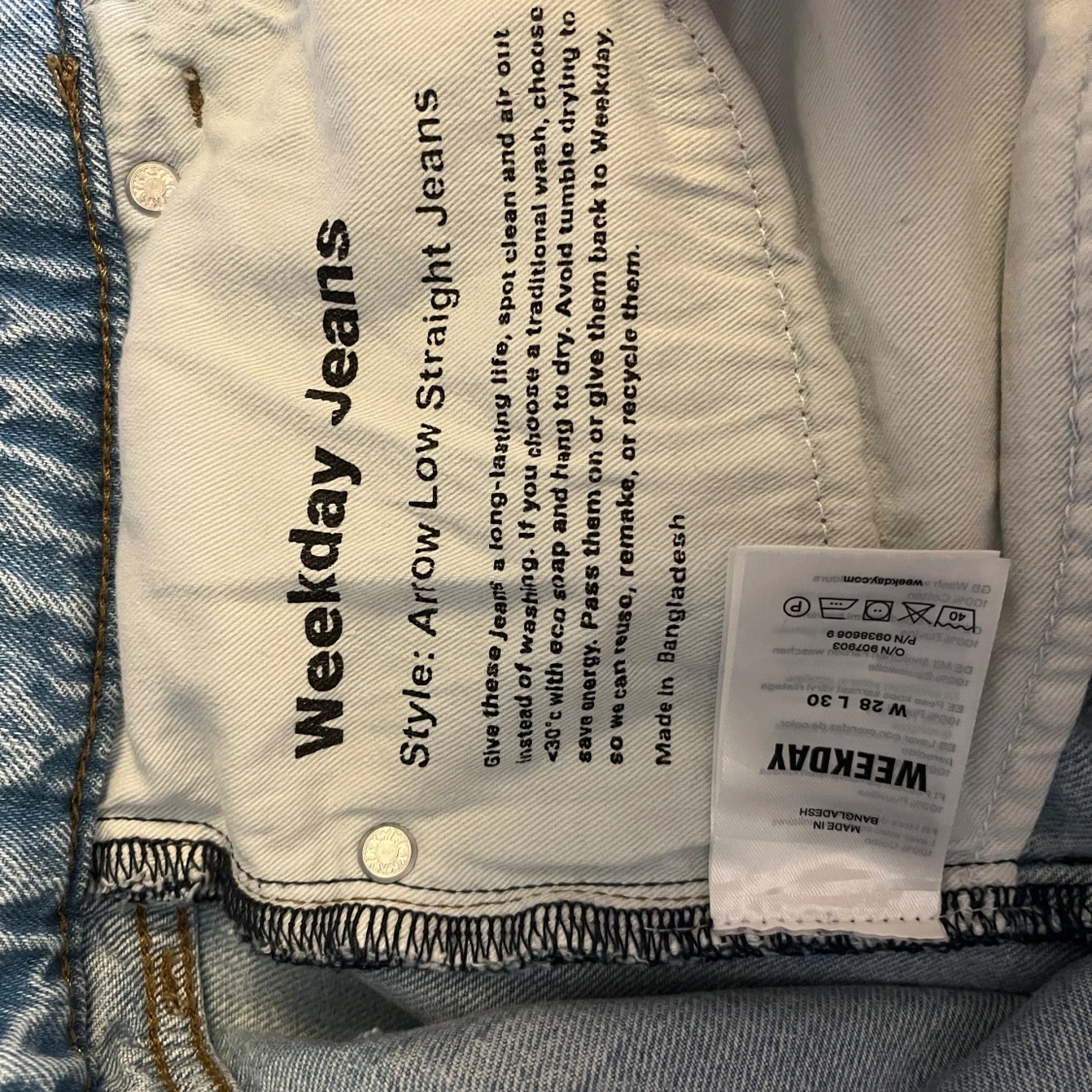 Säljer ett par blå jeans från Weekday i modellen Arrow Low Straight. Jeansen har klassisk femficksdesign, låg midja och raka ben. Mycket bra skick och inte särskilt mycket använda. Storlek W28 L30