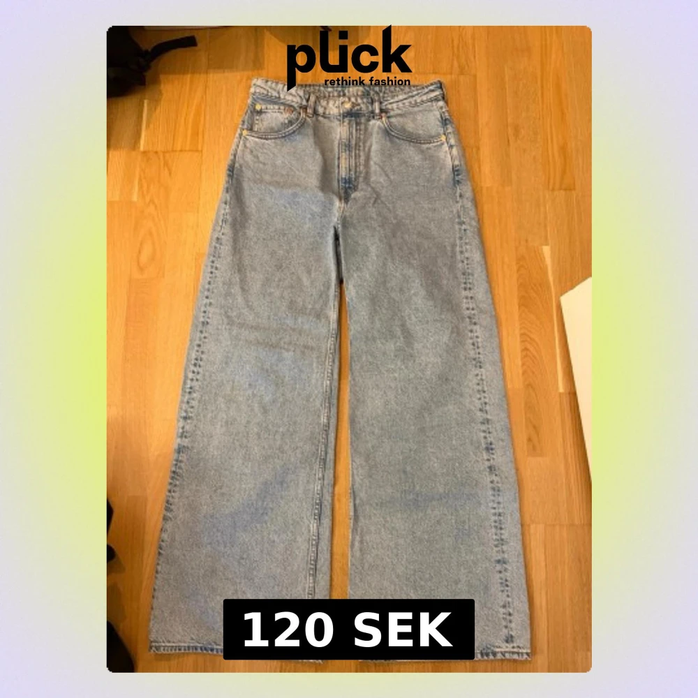 Ett par ljusblå jeans med vida ben och hög midja. Jeansen har klassiska detaljer som fickor fram och bak samt bälteshällor. Från weekday W30 L32