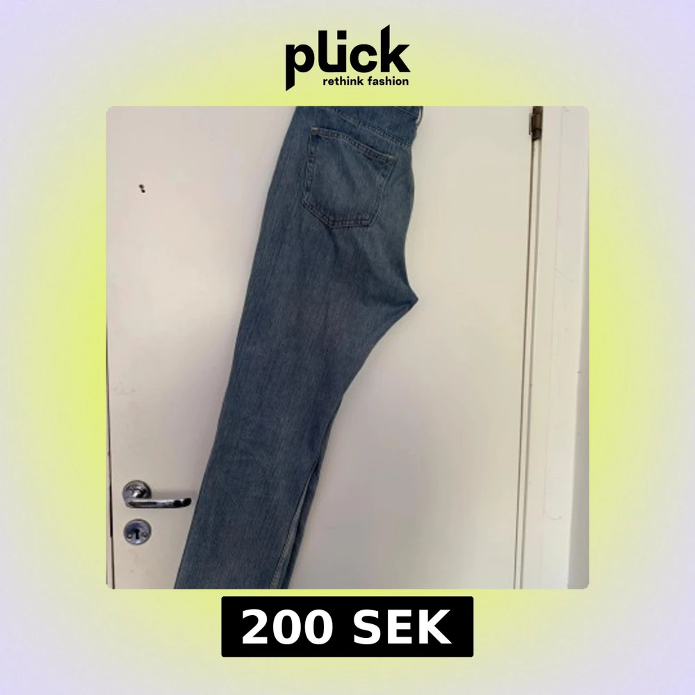 Säljer ett par klassiska blå jeans från Weekday med raka ben och normal passform. Byxorna har fem fickor, knappar i gylfen och är tillverkade i bomull. Perfekta för en avslappnad stil.