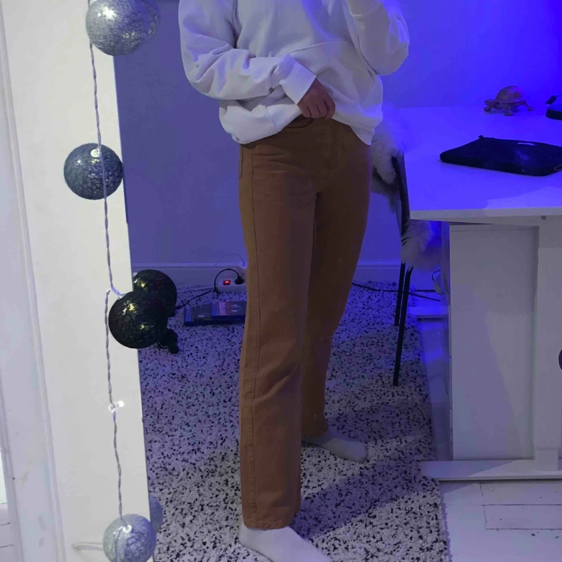 Ett par kamelfärgade jeans från Weekday i modellen Row. Snygga och sitter bra på mig som är ungefär 175cm. Säljer pågrund av att jag behöver pengar😬💓 köpta för 500kr säljer för 290, spårbar frakt tillkommer på 63kr