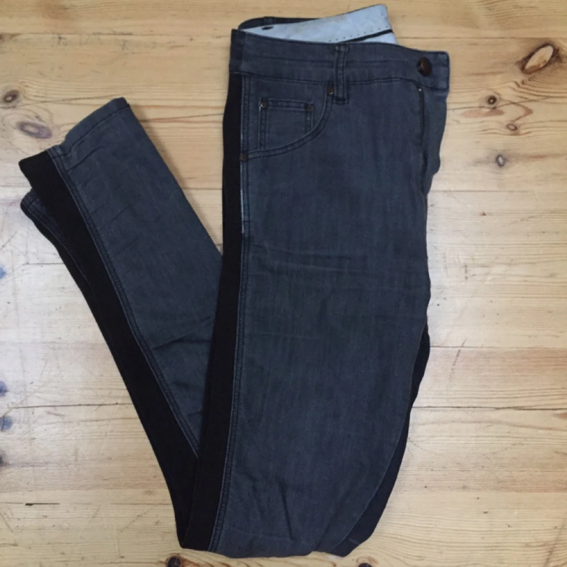 Snyggt slitna Whyred-byxor med svart resor på yttre benet.