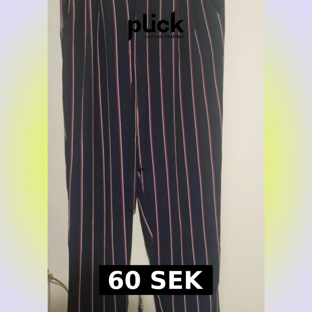 Snygga mörkblå byxor med vertikala vita och röda ränder. Byxorna har ett medföljande bälte i samma tyg och en rak, lite loose passform. Perfekt för dig som gillar en trendig och bekväm stil. Midjan är normal och materialet känns mjukt och följsamt.