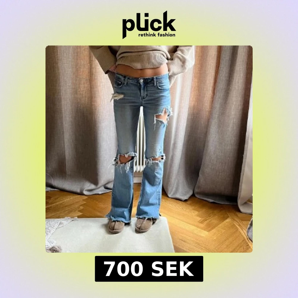 Snygga blå bootcut jeans med slitningar på knäna och låren. Low waisted och bootcut. från amarican egals. säljs då dem var förstora för mig. passar någon som är 163 pris kan diskuteras💞💞