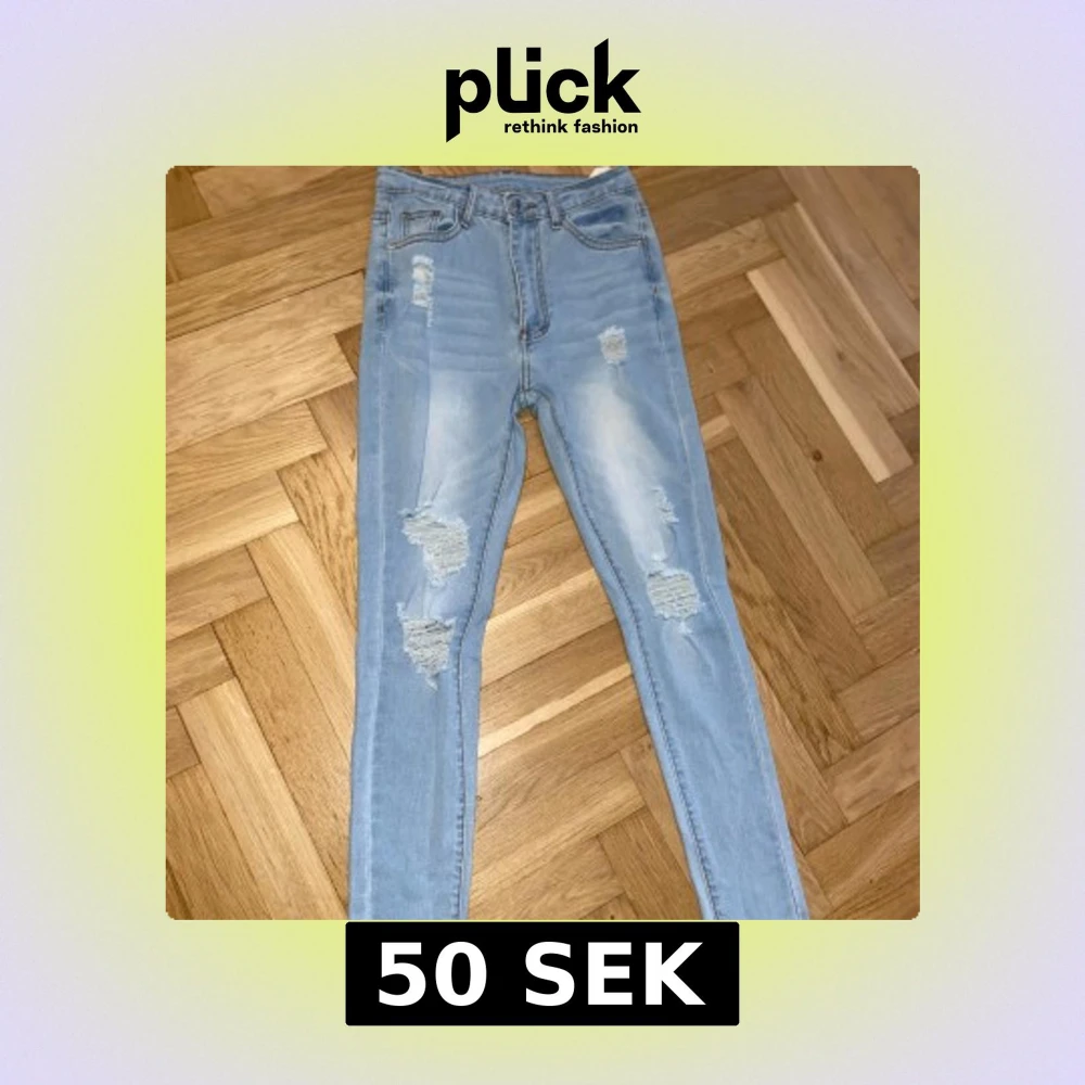 Säljer ett par ljusblå skinny jeans med slitningar på framsidan. Jeansen har hög midja och dragkedja med knapp. Perfekta för en avslappnad och trendig look.