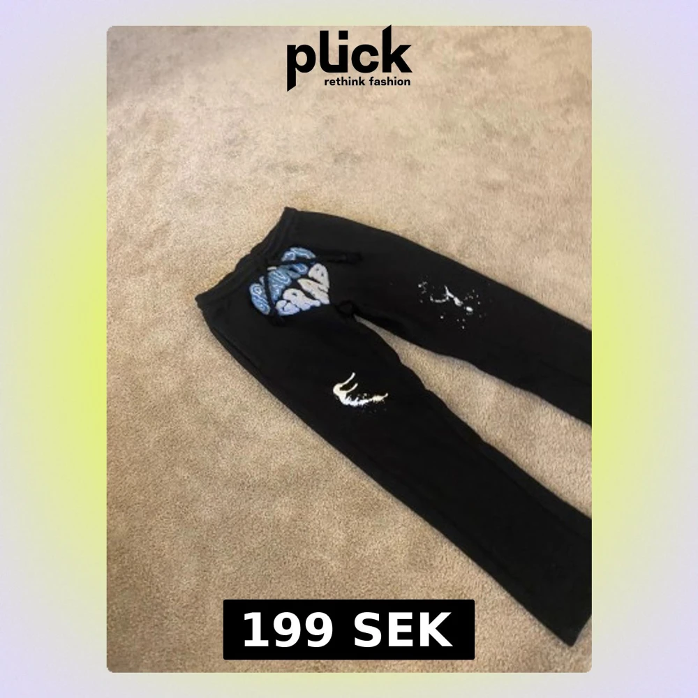 Svarta mjukisbyxor med blått och vitt broderat gravity grab-motiv framtill, samt vita färgstänk på benen. Byxorna har snörning i midjan och är gjorda i mjukt material som är skönt att ha på sig. Perfekt för chill eller streetwear.