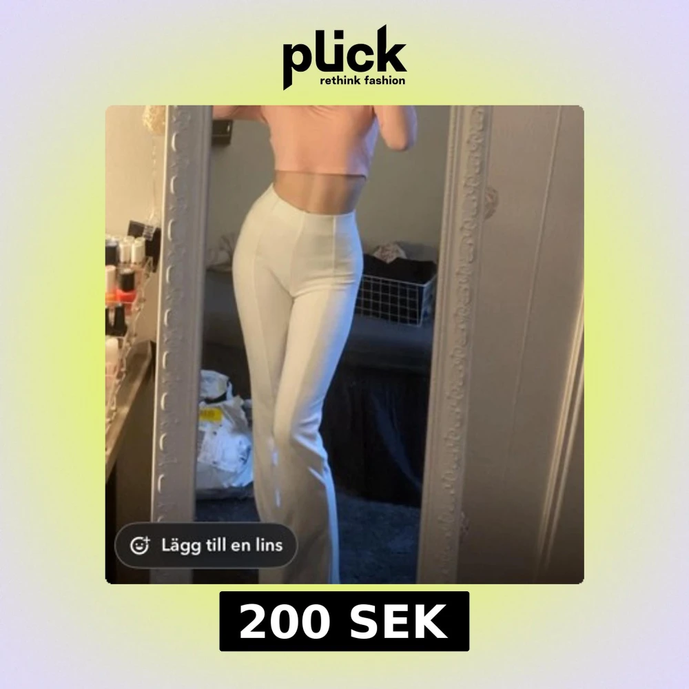 Säljer ett par vita bootcut byxor med hög midja och figurnära passform. Byxorna har en clean look utan synliga fickor eller detaljer, och är perfekta om du gillar en stilren och trendig vibe. Materialet känns mjukt och stretchigt, vilket gör dem riktigt sköna att bära.