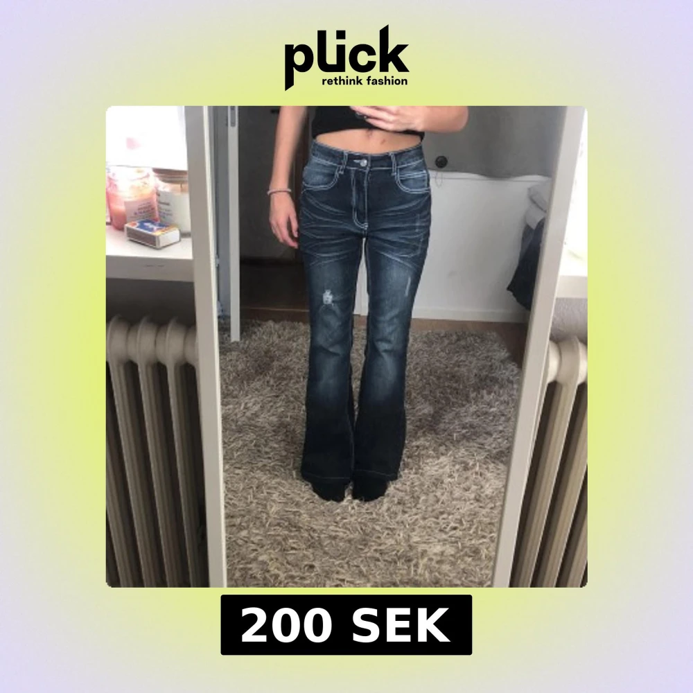 Snygga blå bootcut jeans från Romwe i storlek XS. Jeansen har hög midja, markerade sömmar och slitningar framtill. Baksidan har stora fickor med coola detaljer och dekorationer. Materialet är en klassisk jeansblandning med bomull och polyester.