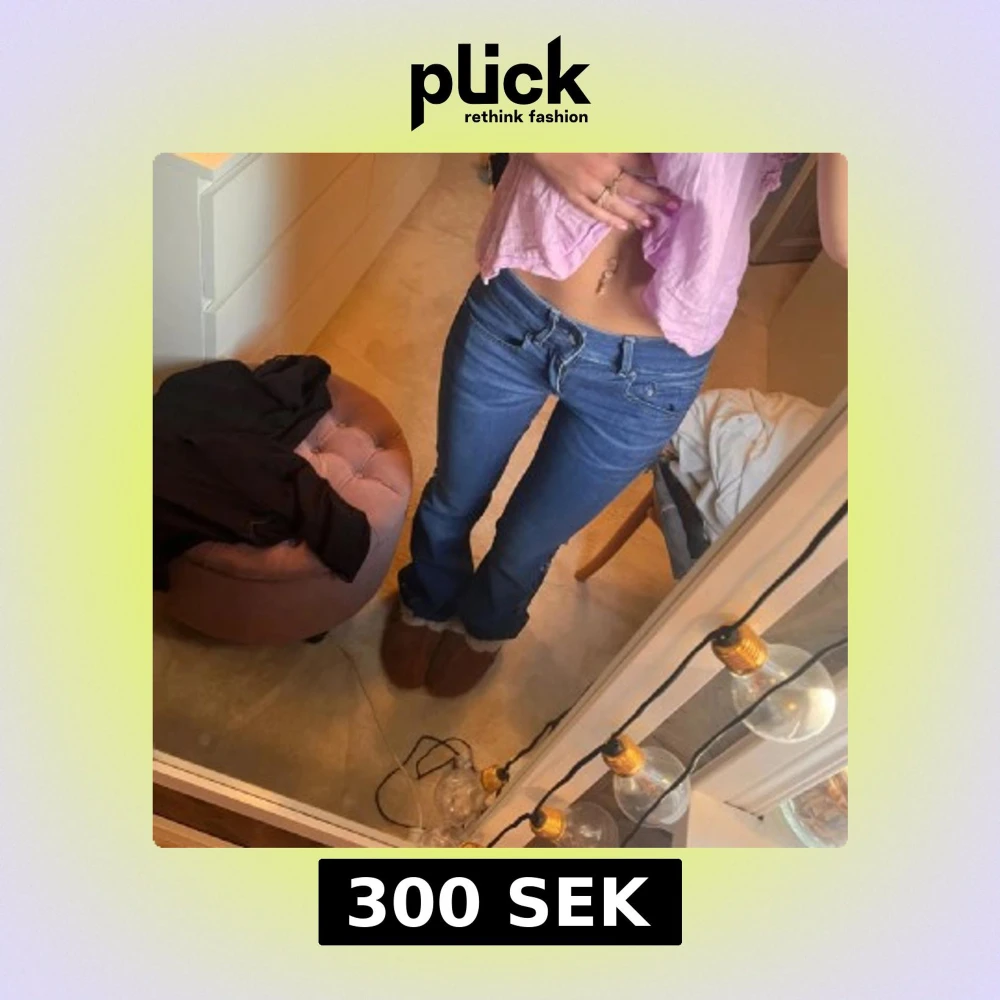 Säljer ett par blå jeans med bootcut-modell och låg midja. Jeansen har klassisk femficksdesign och är tillverkade i denim. Insidan av benen har ett coolt mönster i ljusare blått när man viker upp dem. Perfekta för dig som gillar en avslappnad och trendig stil.