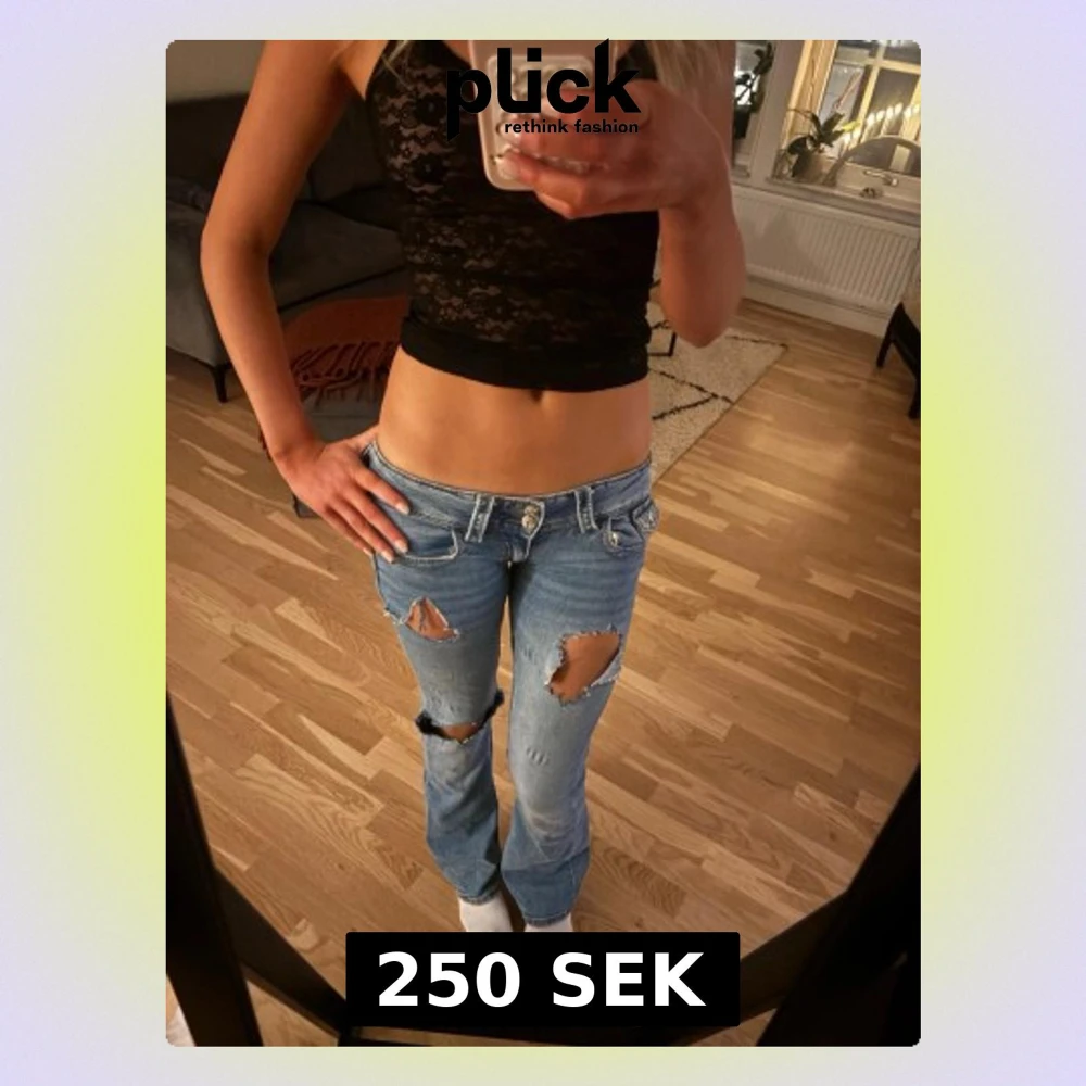 Säljer ett par ljusblå bootcut jeans med stora slitningar på båda benen. Jeansen har låg midja, klassisk femficksdesign och är gjorda i jeansmaterial. Perfekta för dig som gillar en edgy och avslappnad stil.