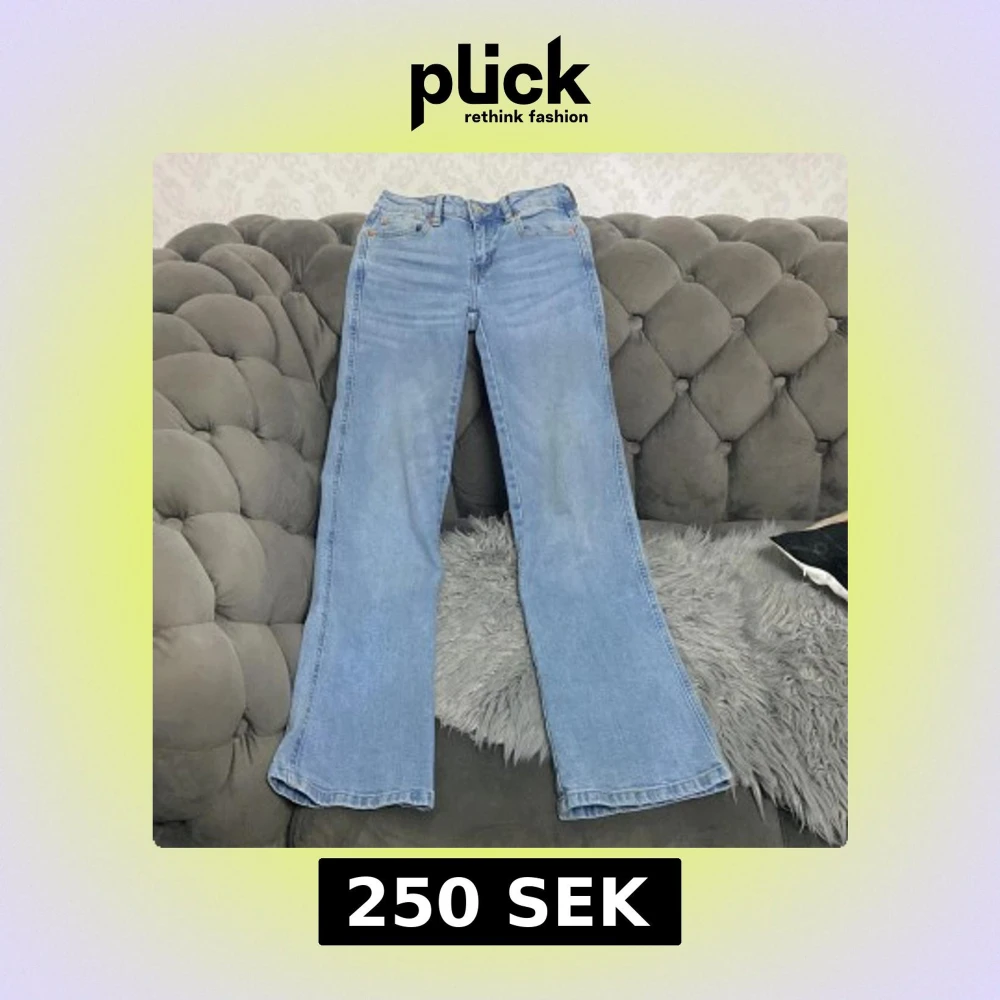 Snygga blå bootcut jeans med klassisk femficksdesign och knappgylf. Perfekta för en avslappnad stil med en touch av retro. Passar bra till sneakers eller boots. Jag har använt dem en enda gång, så dem är nästan helt nya! 😊