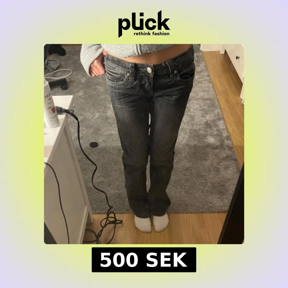 Säljer ett par grå lågmidjade bootcut jeans med detaljer på bakfickorna. Storlek 24 Mini defekt (sista bild) då jag satt skosnöre i midjan