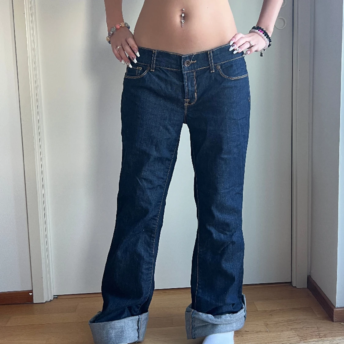 Jättefina jeans, men säljer pga att de är för långa för mig, därför har jag vikt upp dem 💙Står storlek 44 på lappen men passar mig (storlek S 163cm) bra 💙