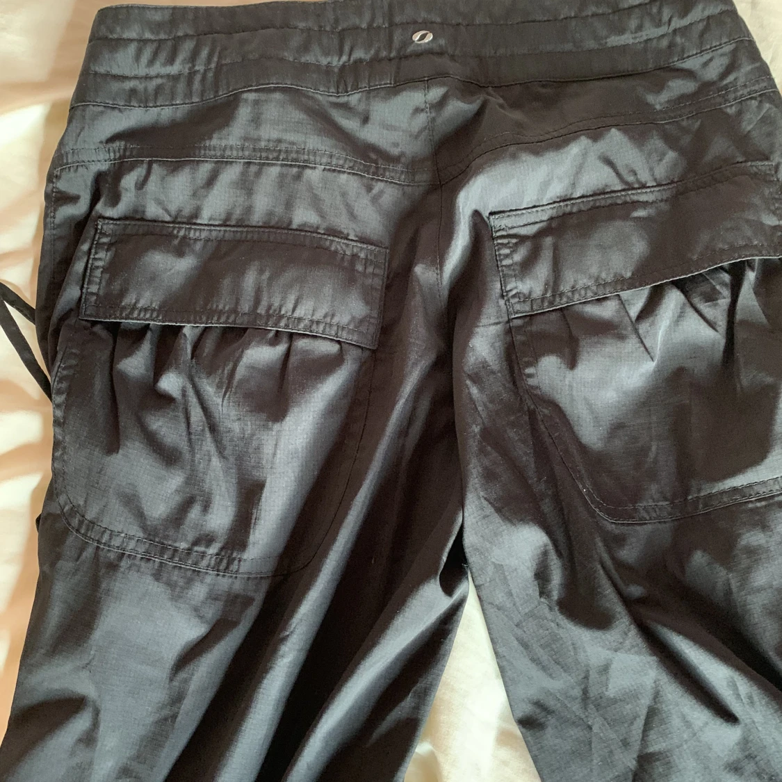 svarta lite pösiga byxor. Påminner lite om parachute pants. Är mindre glansiga än vad de ser ut på det två sista bilderna.