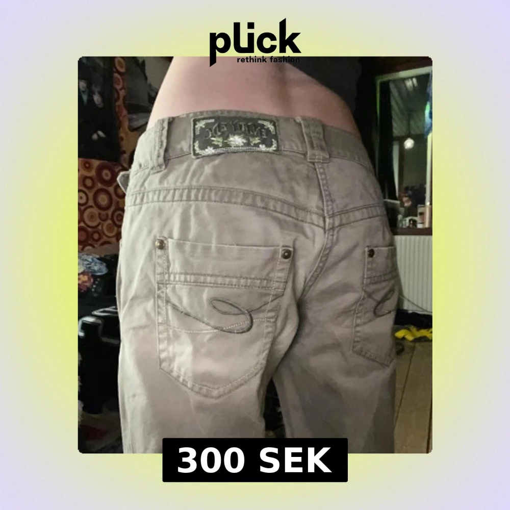 Beiga y2k jeans i storlek S. Har snygga gröna sömmar och detaljer! Mycket bra skick.