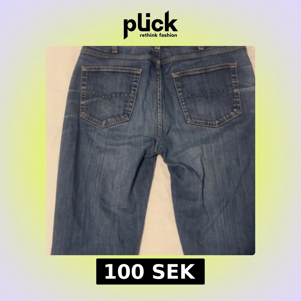 Säljer ett par blå jeans med snygga detaljer vid fickorna. Knappt använda men några stenar saknas.