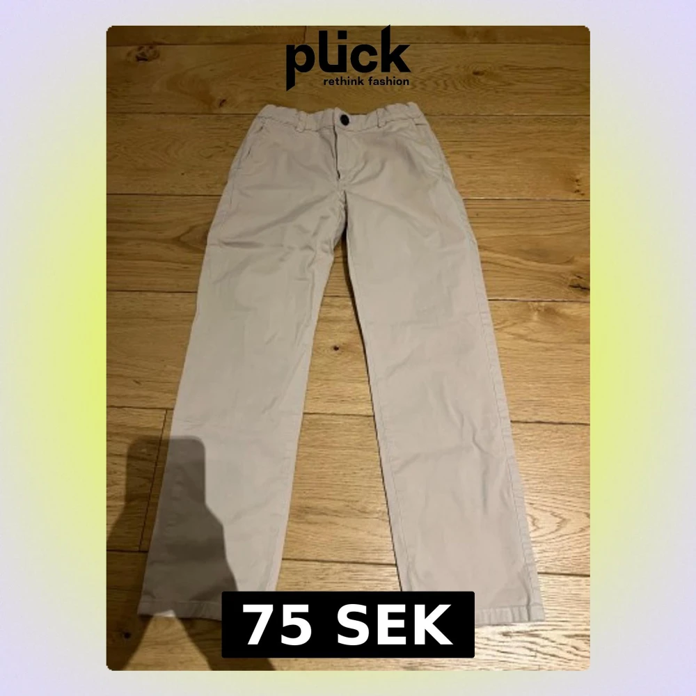 Beiga chinos i storlek 140. Bra passform och i mycket fint skick – inga fläckar eller hål. Bekväma och lätta att röra sig i.