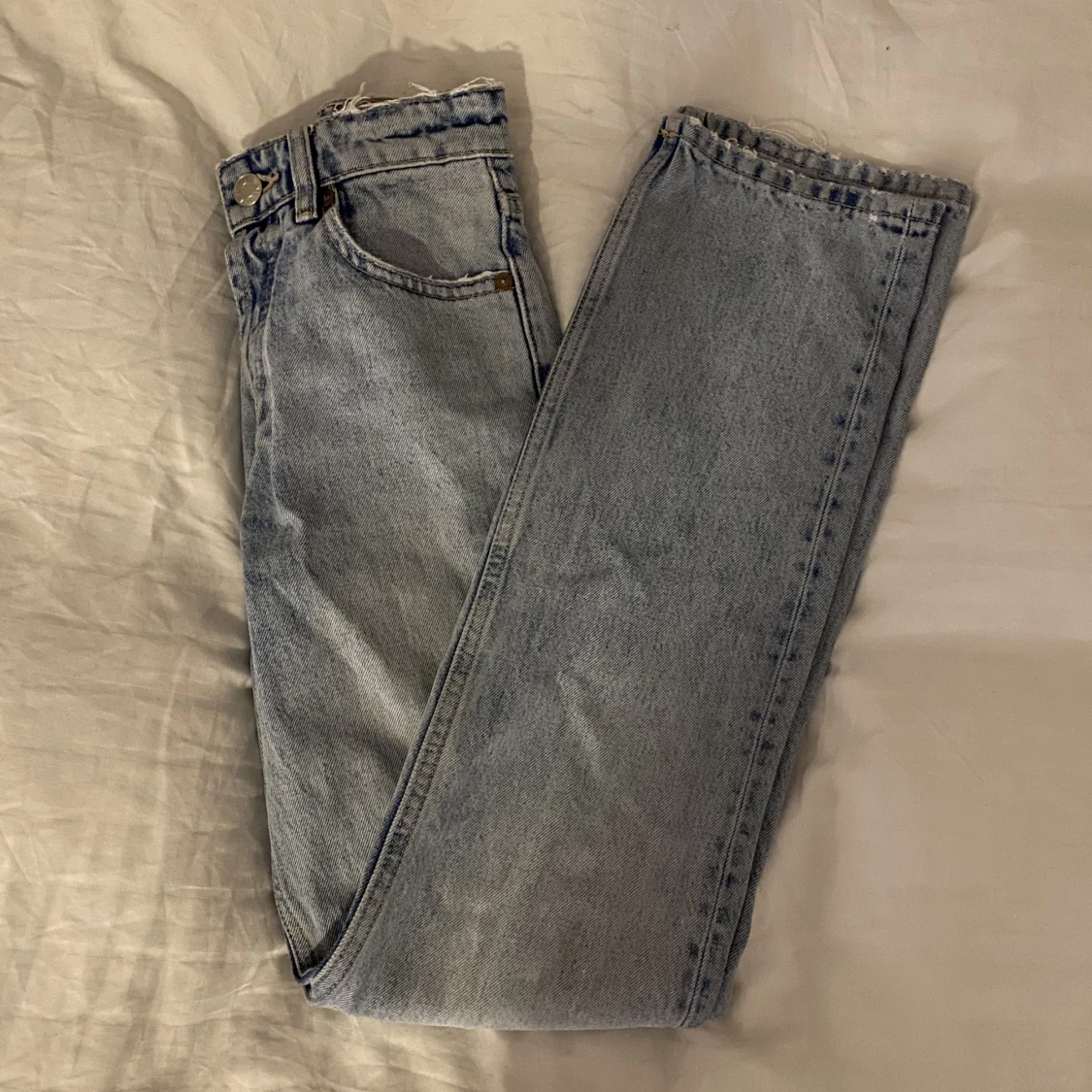 Säljer mina blåa straight jeans ifrån Zara då de tyvärr inte passar längre. De är använda men har ändå inta skick, därav pris💕💕