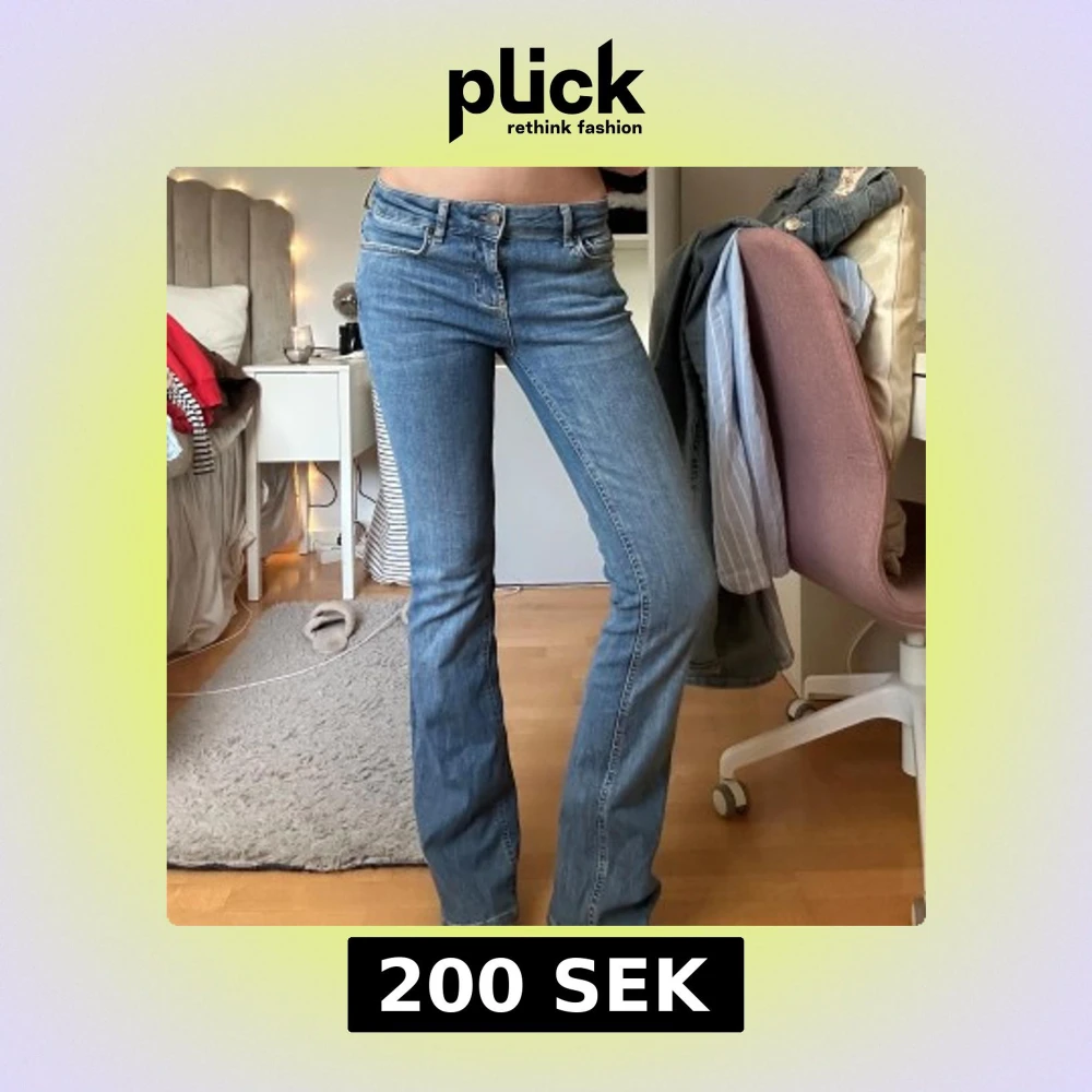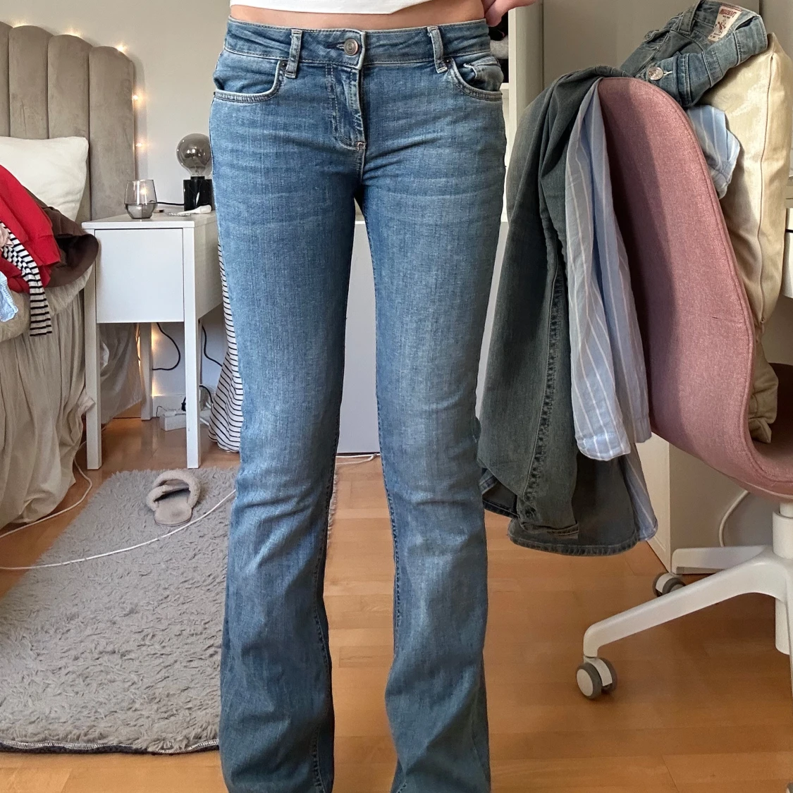 Snygga blå jeans med bootcut passform och låg midja. Klassisk femficksmodell i mjukt denimtyg med lätt tvättad look. Perfekta för dig som gillar en avslappnad men ändå trendig stil.Midjemått- 33 cm tvärs över(stretchigt material), innerben- 81