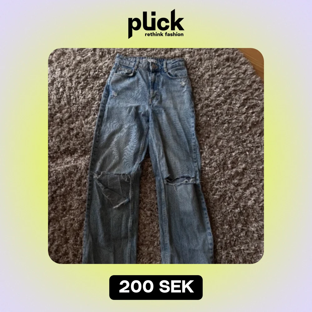 Jeans köpta från Zara i ljusblått jeanstyg. De har en sliten look och en beninnerlångd på 86 cm. Högmidjade och åtsittande upptill (32 cm i midjemått) men raka/ vida ben. Tyvärr lite slitna vid fållen då de är för långa för mig (bild 3). Storlek 34 💙