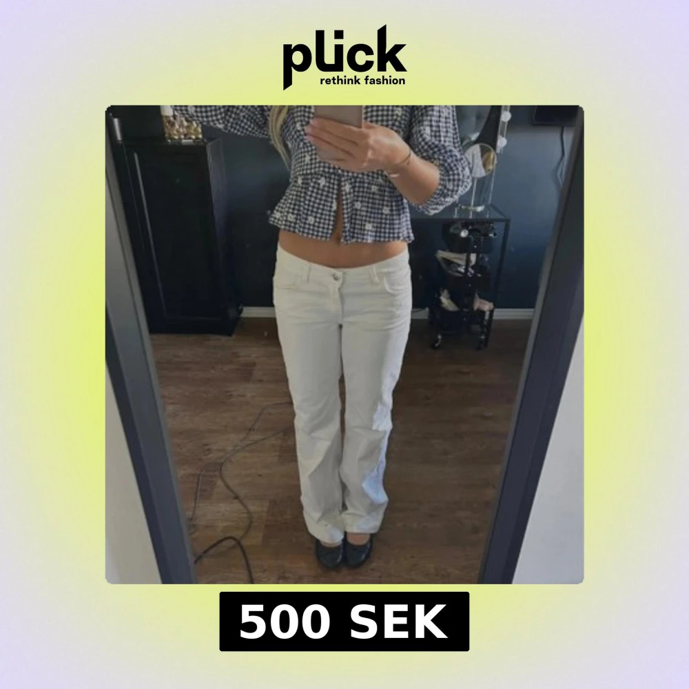 Säljer ett par vita jeans med låg midja och raka ben. Byxorna har klassisk femficksdesign och stängs med knapp och dragkedja. Perfekta för dig som gillar en clean och stilren look. Passar till allt och är superenkla att styla.