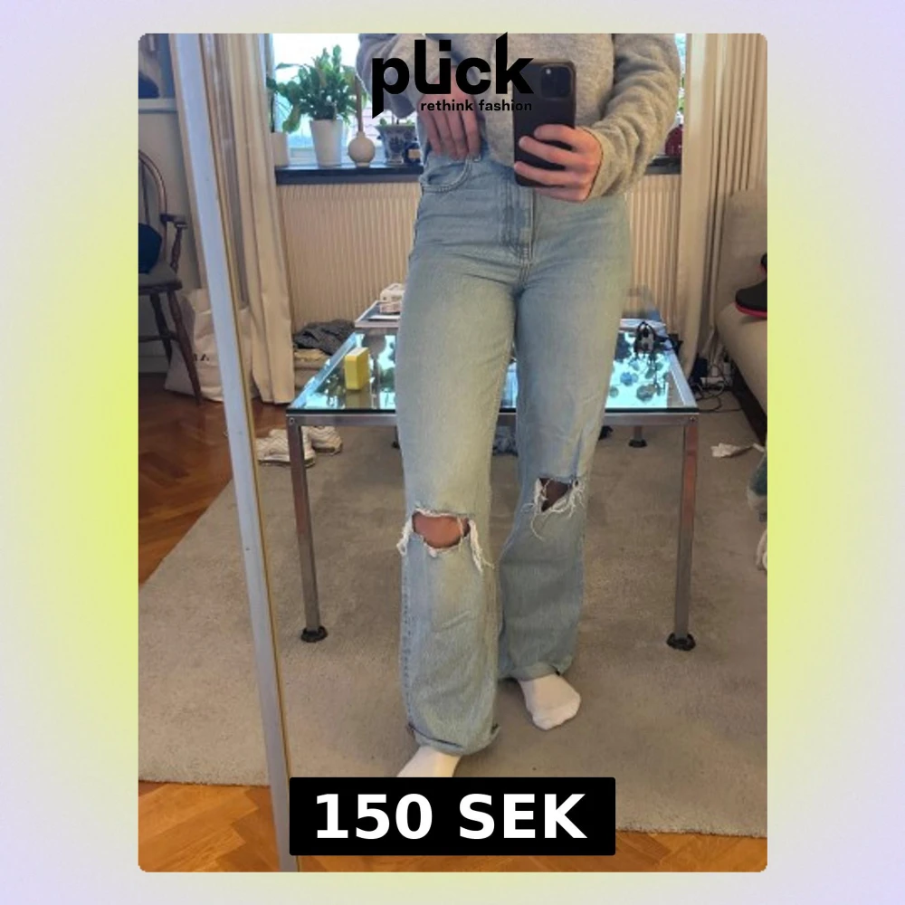 Säljer ett par ljusblå jeans från Zara med hög midja och raka, vida ben. Jeansen har snygga slitningar och hål vid knäna. Klassisk femficksmodell och tillverkade i jeansmaterial.