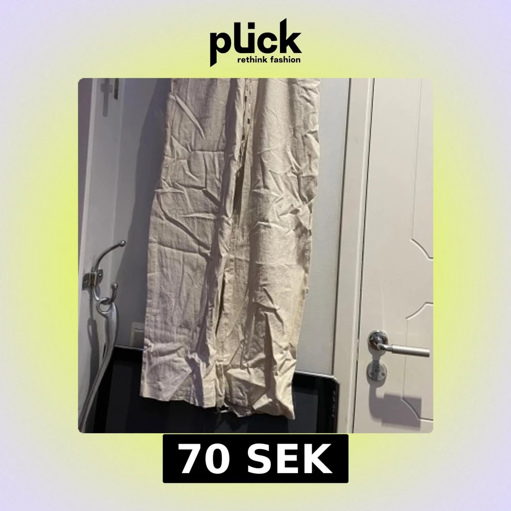 Säljer ett par beige linnebyxor med avslappnad passform och resår i midjan. Byxorna har en enkel design och är tillverkade i ett luftigt linnematerial, perfekt för varma dagar. Färgen är ljusbeige och tyget har en naturlig struktur. Dem är trasiga nertill och smutsiga då dem är för långa för mig.