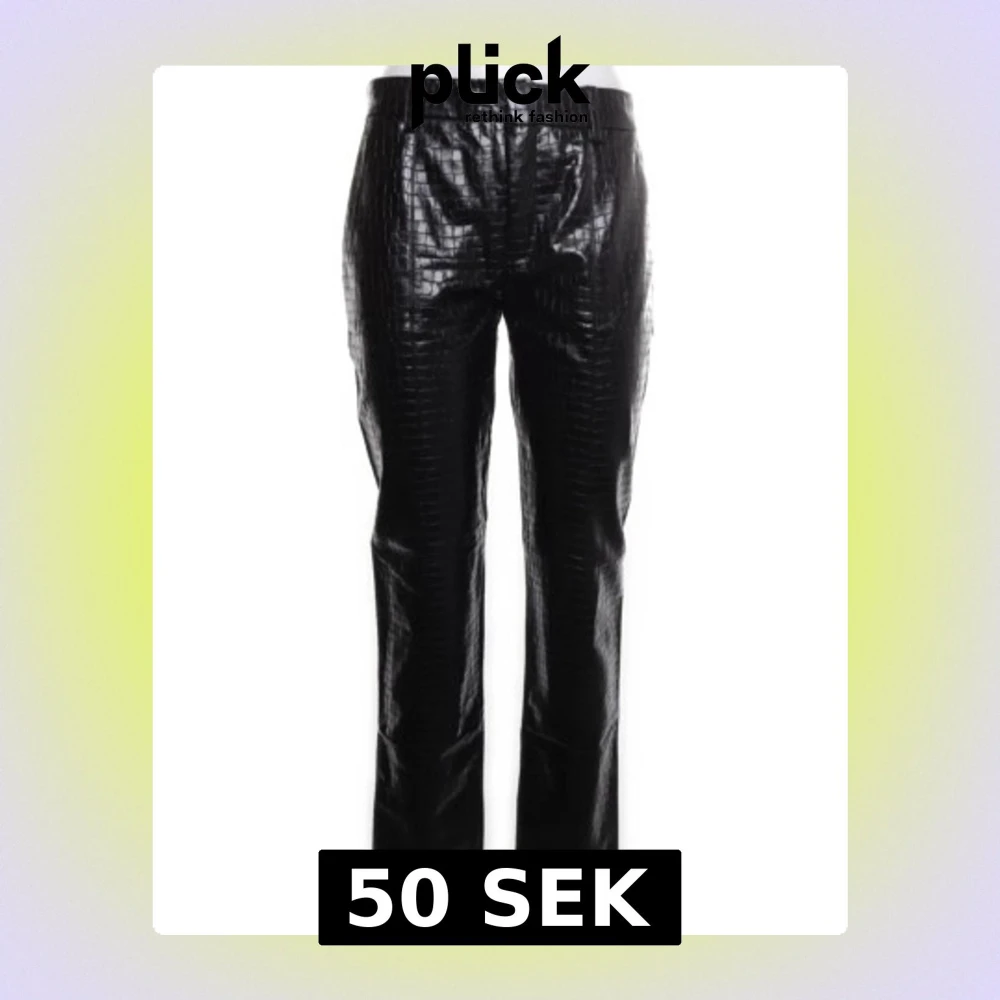Säljer ett par svarta byxor från Zara i storlek S med croco-mönstrad yta och glansig finish. Byxorna har raka ben med slits framtill och är tillverkade i polyester med bomullsfoder. Perfekt för dig som vill sticka ut med en edgy look.