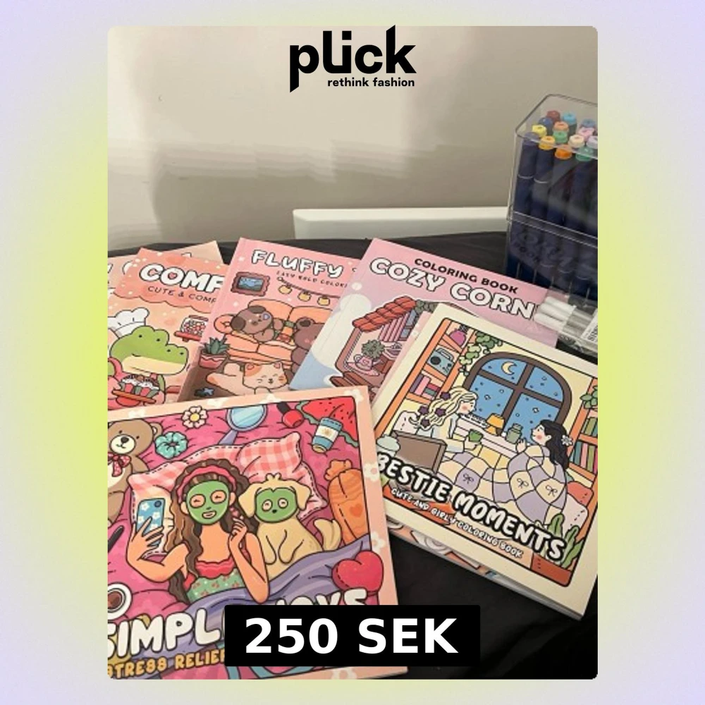 Säljer flera målarböcker med söta och mysiga illustrationer, perfekta för avkoppling och kreativitet. Omslagen är färgglada med motiv av djur, vänner och vardagsscener. Böckerna har mjuka pärmar och är fyllda med detaljerade bilder att färglägga. Pennorna är använda sen jul. Vissa böcker är målade