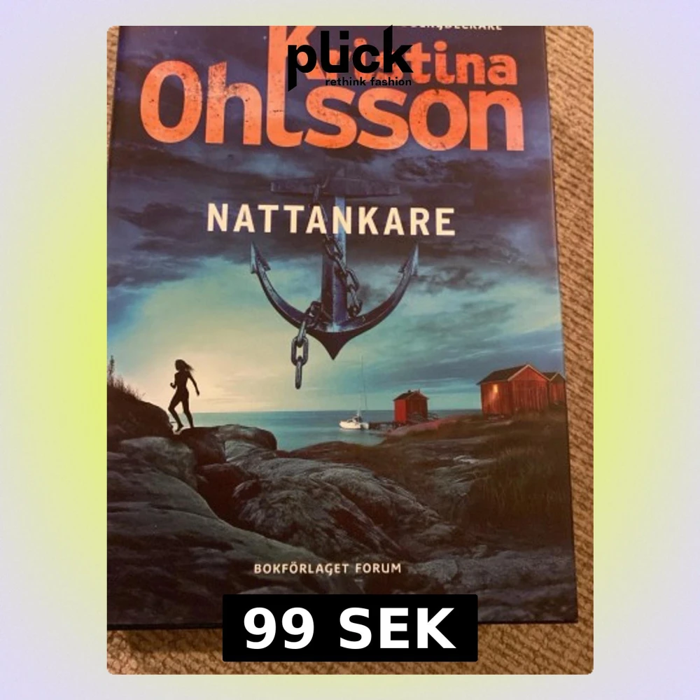 Spännande skönlitterär bok med titeln 'Nattankare' av Kristina Ohlsson. Omslaget har en dramatisk illustration med ett stort ankare, en siluett av en person, hav, klippor och röda sjöbodar i bakgrunden. Perfekt för dig som gillar mysterier och äventyr.
