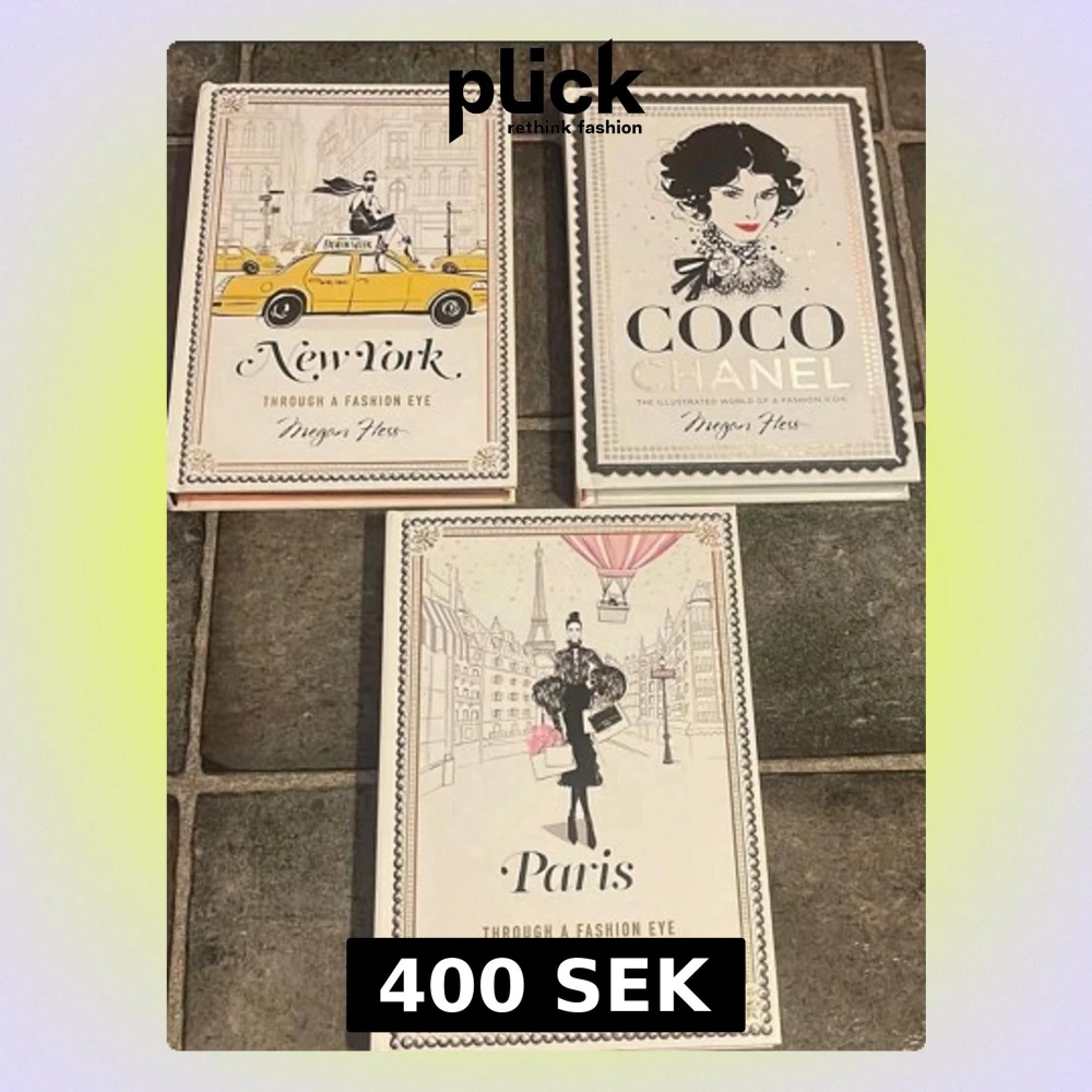 Säljer tre snygga illustrerade böcker: 'New York Through a Fashion Eye', 'Paris Through a Fashion Eye' och 'Coco Chanel'.