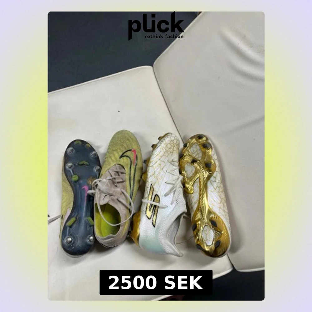 Två par fotbollsskor, ett par Nike i gulgrönt med svart och rosa swoosh, och ett par sketchers i vitt med gulddetaljer och svart logga. Phantom lite använda med nya skruvdubb. 1800 kr för dem. Sketchers hela oanvända 1100 för dem . 2500 för båda. Hör av er vid bud