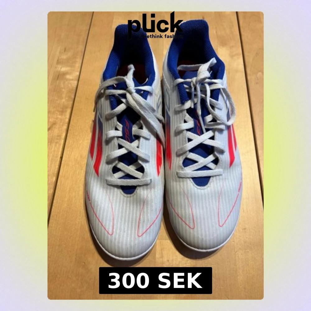 Säljer ett par Adidas fotbollsskor i vitt med röda och blå detaljer. Skorna har snörning, låg profil och är tillverkade i syntetmaterial med textilfoder. Perfekta för dig som vill ha lätta och snabba skor på planen.