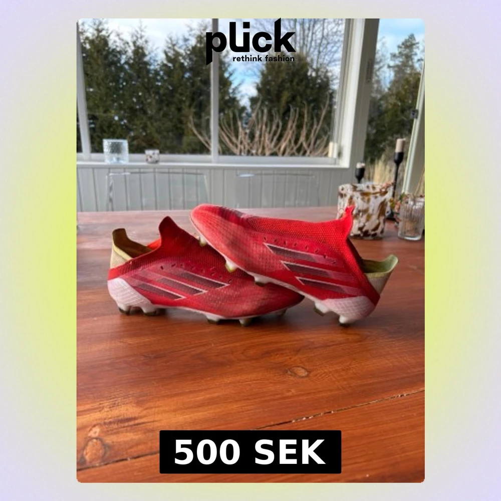 (Har bara en skroma och det är de vid strumpan annars är allt prima)Säljer ett par röda Adidas fotbollsskor *snörning kan man få med vid behov*med vita och svarta detaljer samt gula dobbar. Skorna har en strömlinjeformad design och är tillverkade i syntetmaterial för bästa grepp och känsla på planen. Perfekta för dig som vill ha stil och funktion på fotbollsplanen. Storlek 40 men funkar för 41