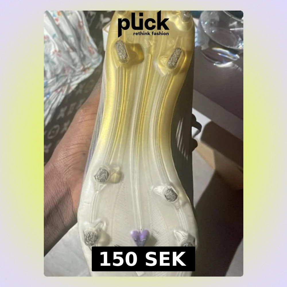 Säljer ett par Adidas fotbollsskor med vita och gula detaljer samt lila inslag. Skorna har snörning och en lätt, ribbad ovandel för bra bollkontroll. Sulan har fasta dobbar för spel på naturgräs. Perfekta för dig som vill ha stilrena och snabba skor på planen.