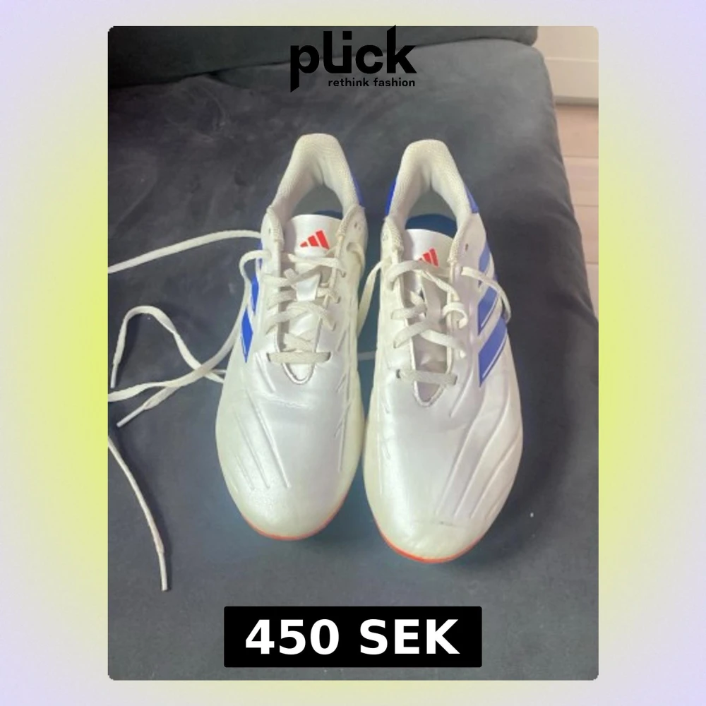 Säljer ett par vita fotbollsskor från Adidas med klassiska blå ränder på sidorna och röda detaljer på plösen. Skorna har snörning och en låg profil, perfekta för snabba rörelser på planen. Yttermaterialet är syntetiskt och designen är sportig och modern.