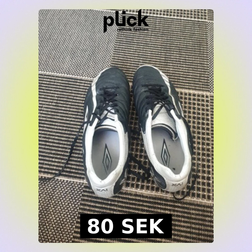 Säljer ett par klassiska fotbollsskor från Umbro i svart och vitt. Skorna har snörning, låg profil och är tillverkade i syntetmaterial med Umbro-logga på sidan och innersulan. Perfekta för dig som vill ha stilrena och funktionella skor på planen.