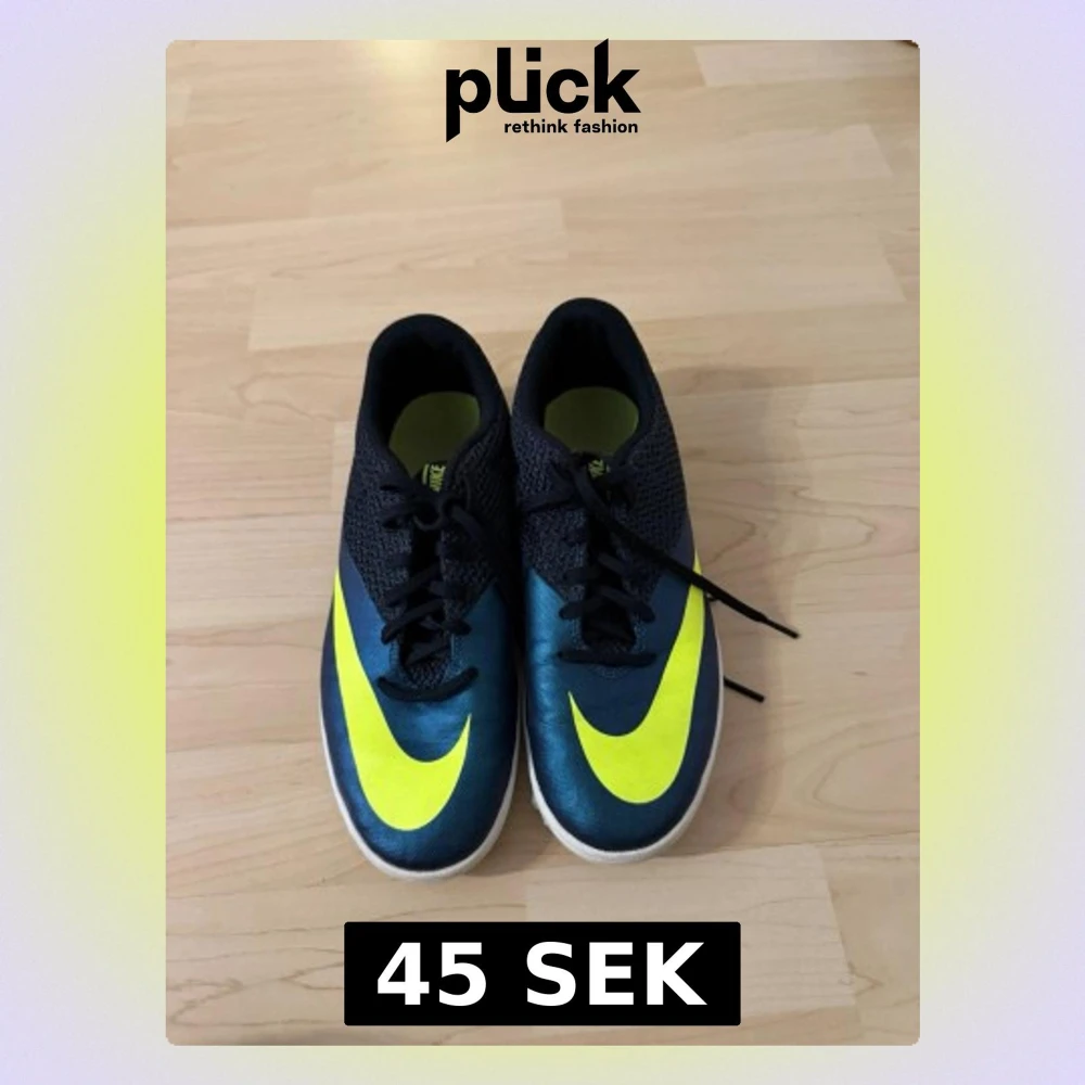 Snygga fotbollsskor från Nike i mörkblått med stora gula swoosh-loggor på ovansidan och sulan. Skorna har svart snörning och vit yttersula med hexagonmönster för bra grepp på planen. Perfekta för dig som vill sticka ut på fotbollsplanen.