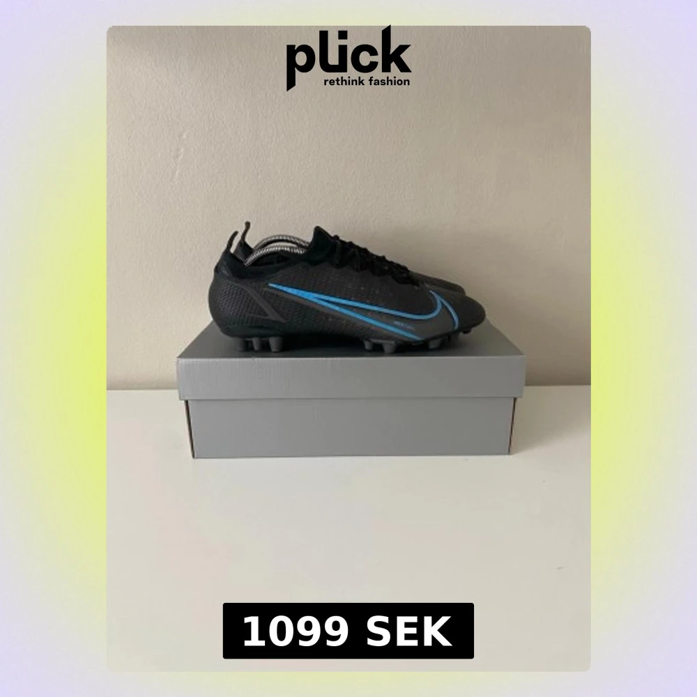 Säljer ett par Nike Mercurial fotbollsskor i svart med blå detaljer och klassisk Nike-swoosh på sidan. Skorna har snörning, låg profil och dobbar för bra grepp på konstgräs men fungerar även på gräs. Säljer för att dem är för små.