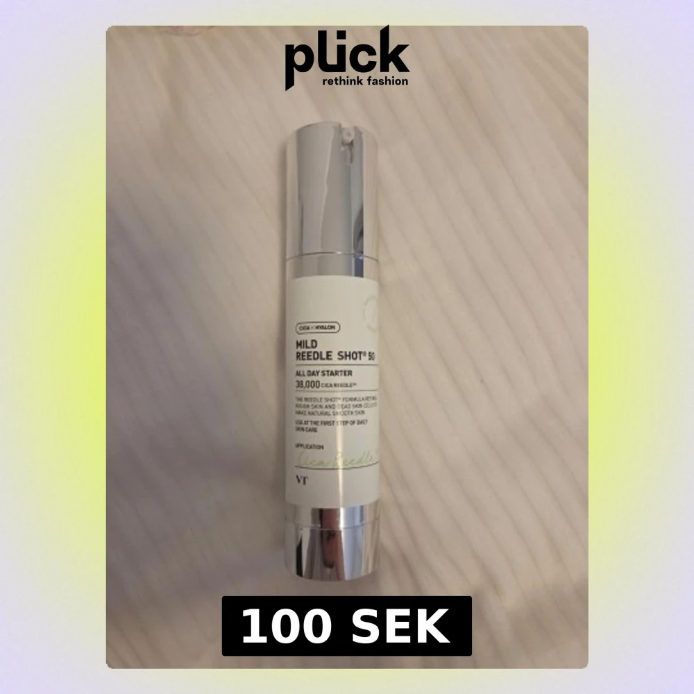Milt ansiktsserum från VT i en elegant vit och silverfärgad pumpflaska. Produkten heter Mild Reedle Shot 50 och innehåller 38 000 CicaReedle, vilket passar för hudvård och ger en fräsch känsla. Perfekt för dig som vill boosta din hudvårdsrutin. Endast testad en gång.