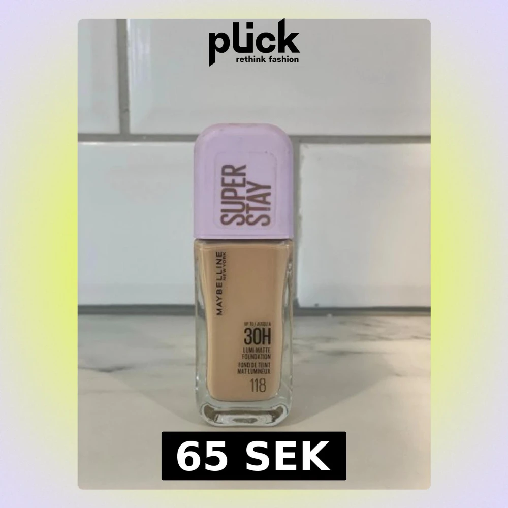 Maybelline Super Stay 30H Foundation i nyansen 118. Kommer i en rektangulär glasflaska med lila plastlock. Ger en matt finish och har en ljus beige ton. Perfekt för dig som vill ha en foundation som håller länge och ger ett jämnt resultat.