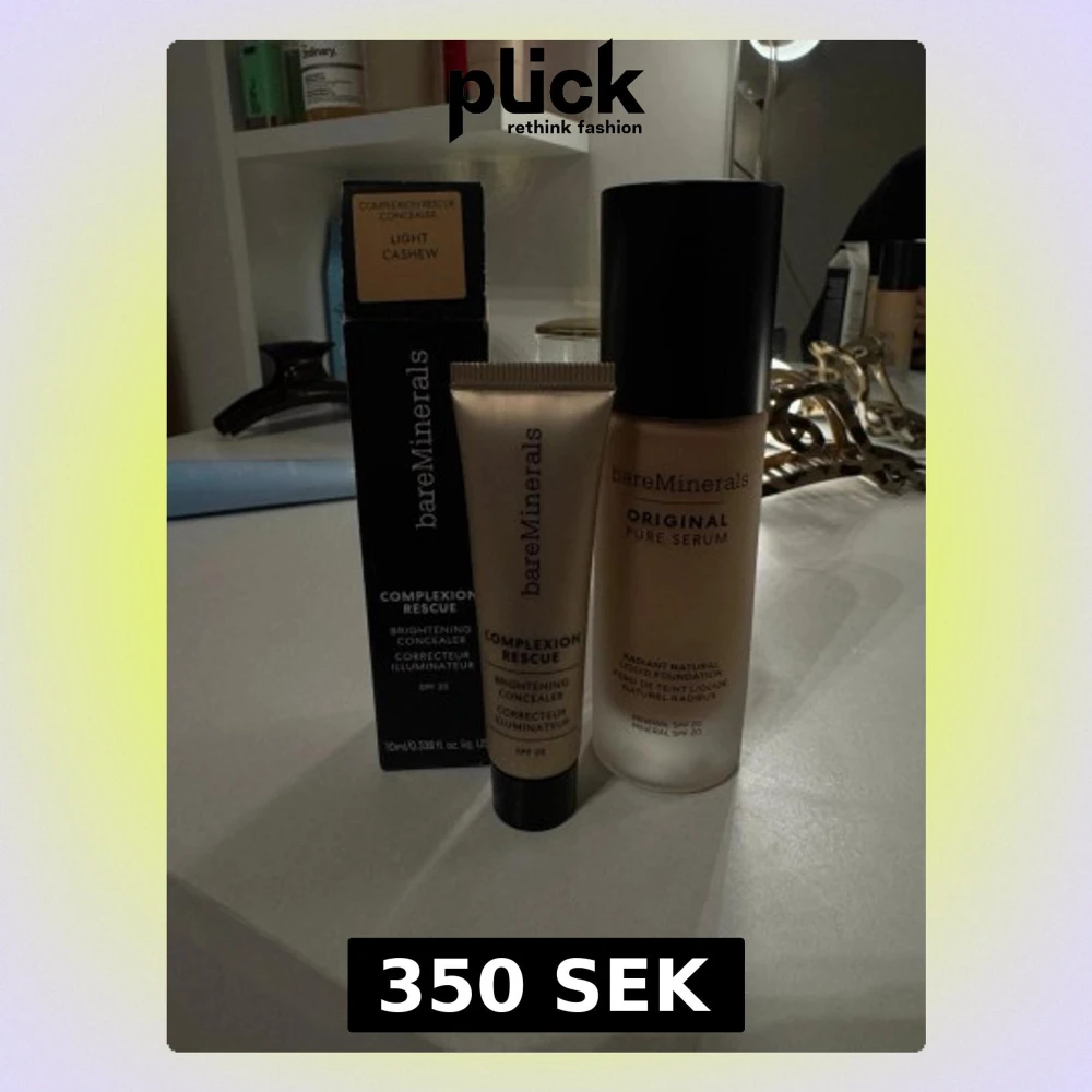 bareMinerals Original Pure Serum foundation i flytande form och Complexion Rescue Brightening Concealer i färgen Light Cashew. Foundationen ger en naturlig finish och innehåller SPF 20. Concealern kommer i en beige tub och är ljus med varm underton. Helt nya och ej öppnade