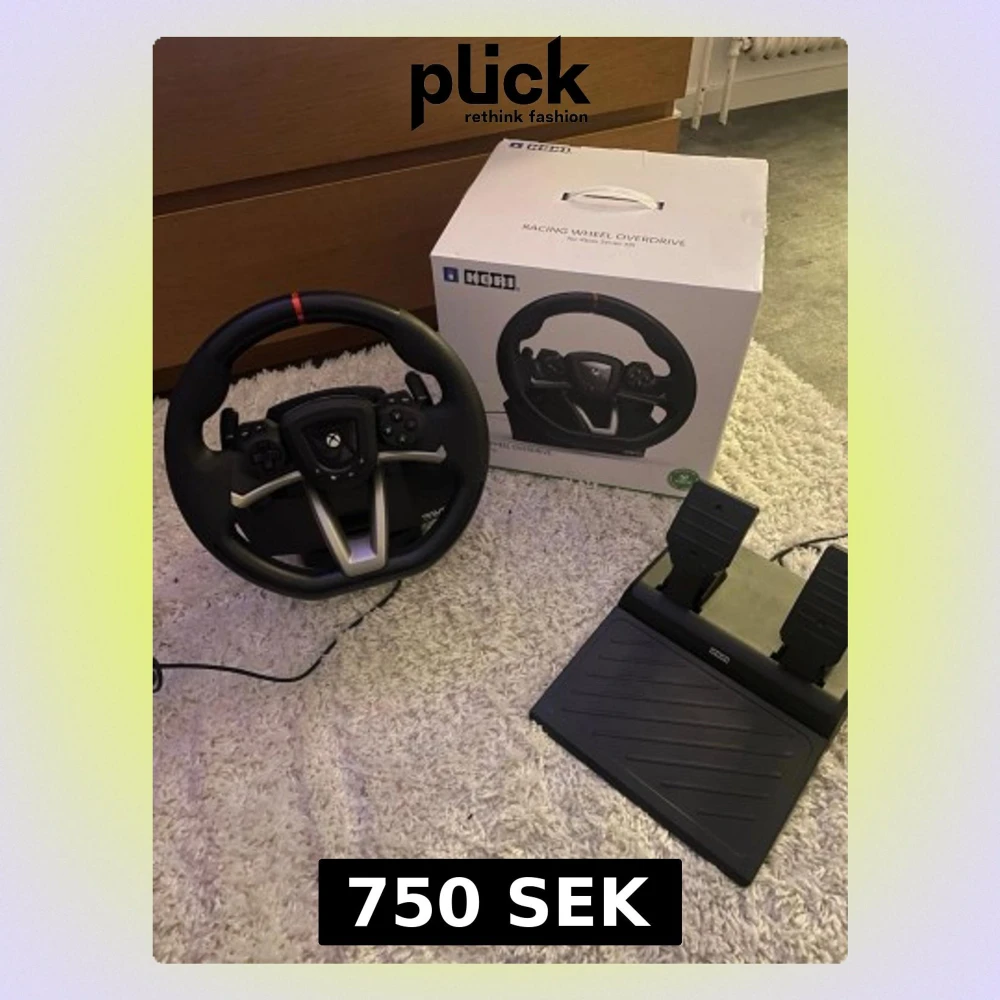 Använder ej därav Säljer jag ett Hori Racing Wheel Overdrive ratt och pedalset för Xbox. Ratten är svart med silverdetaljer och har en röd markering upptill. Pedalerna är svarta och hela setet är gjort i plas och metall. Perfekt för racing och bilspel!