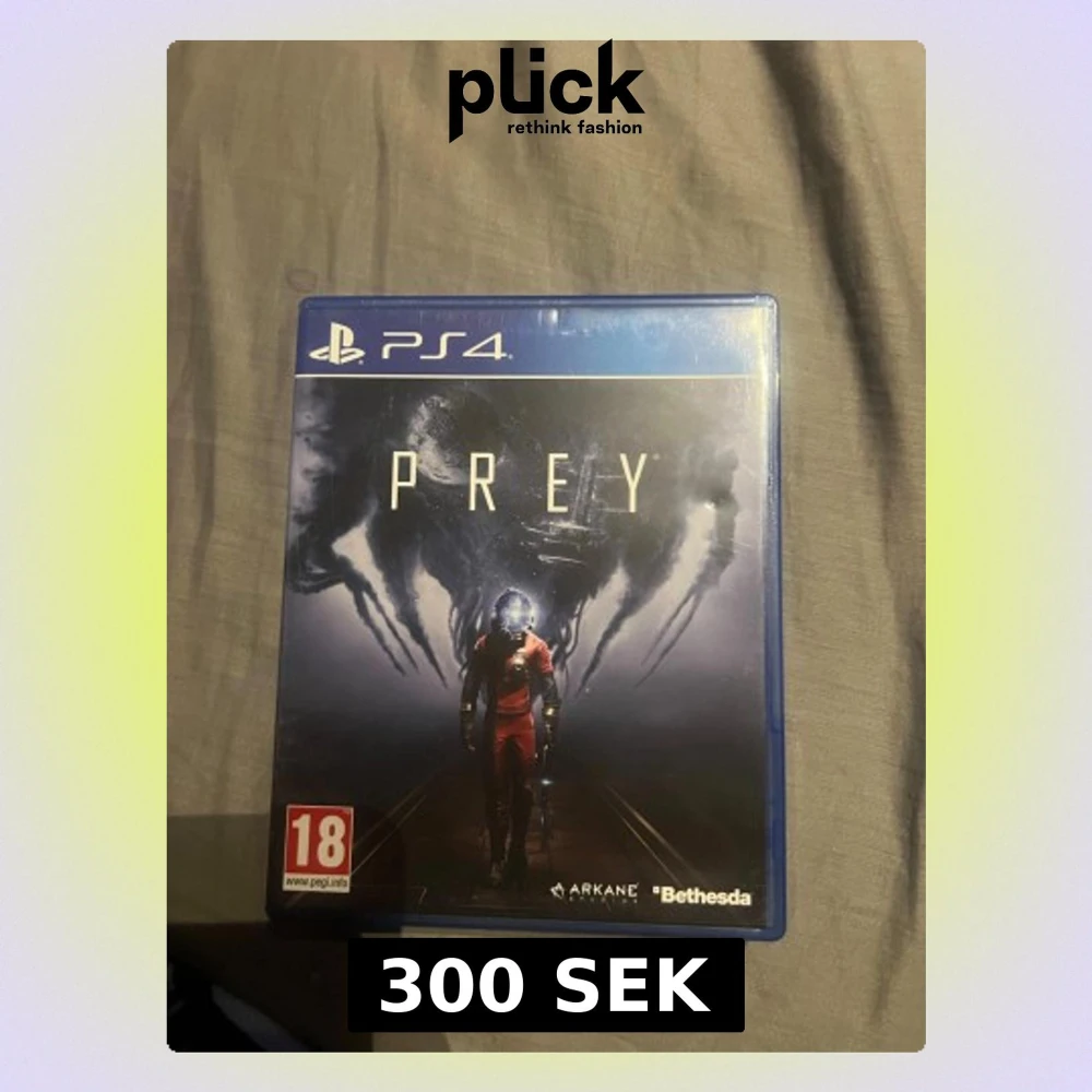 Prey till PlayStation 4, ett sci-fi actionspel från Arkane Studios och Bethesda. Spelet levereras i blå plastfodral med omslag och skiva. Omslaget har en astronaut i röd dräkt och mörka, mystiska former i bakgrunden.
