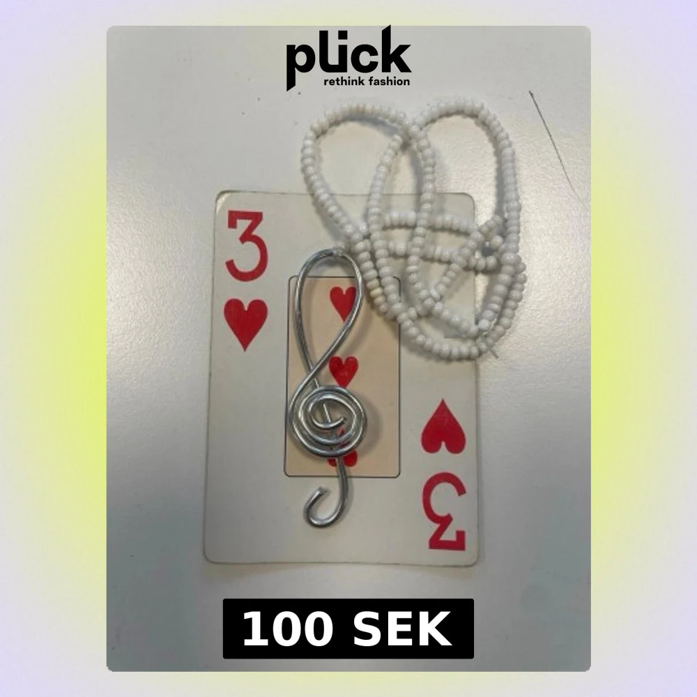 Säljer ett halsband med vita pärlor och en G-klav. Bandet består av flera små vita pärlor och fäst till bandet finns en silverfärgad G-klav gjord av metalltråd. Perfekt för dig som vill sticka ut med ett unikt smycke.