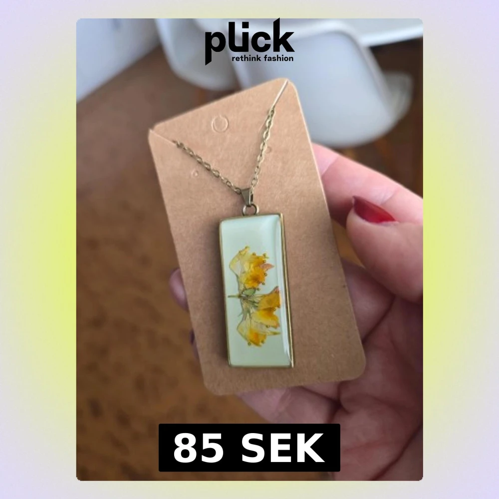 Unikt halsband med rektangulärt hänge i metall och transparent resin där en gul blomma är inneslutna. Kedjan är tunn och 50 cm längt, och hänget har en modern, minimalistisk känsla. Perfekt för dig som gillar naturinspirerade accessoarer och vill sticka ut med något personligt.