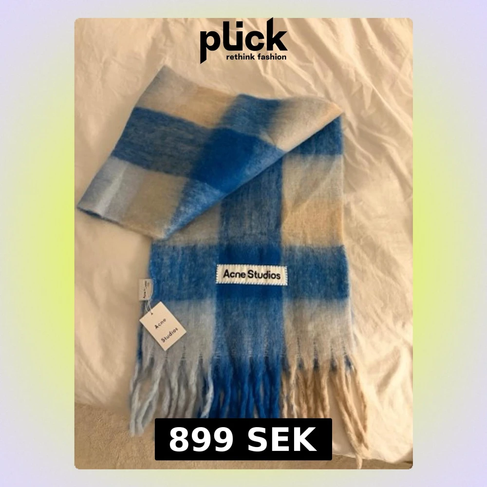 Säljer en fluffig halsduk från Acne Studios i rutigt mönster med blå, beige och vita toner. Halsduken har långa fransar i ändarna och en stor Acne Studios-logga. Tillverkad i mjuk mohairblandning, perfekt för kalla dagar.