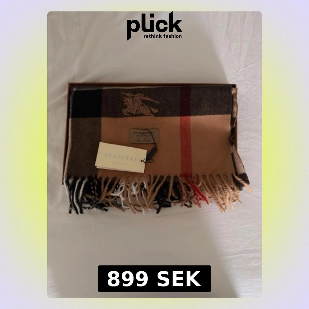 Snygg halsduk från Burberry i klassiskt rutigt mönster med beige, svart, brunt och rött. Halsduken har fransar i ändarna och Burberrys logga broderad på ena sidan. Tillverkad i mjukt material som känns lyxigt och stilrent.