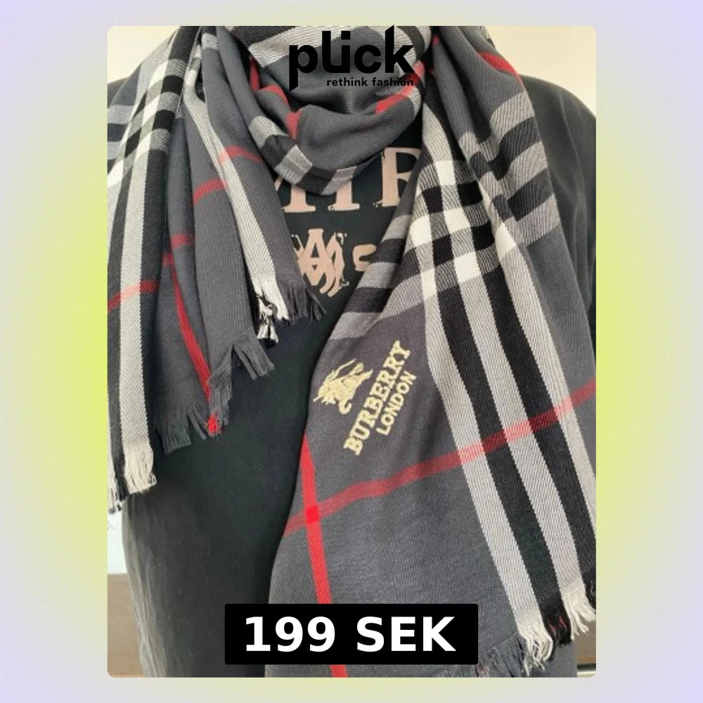 Snygg grå halsduk från Burberryy med klassiskt rutmönster i svart, vitt och rött. Halsduken har fransade kanter och broderad Burberryy London-logga i gult. Perfekt accessoar för att lyfta din outfit.
