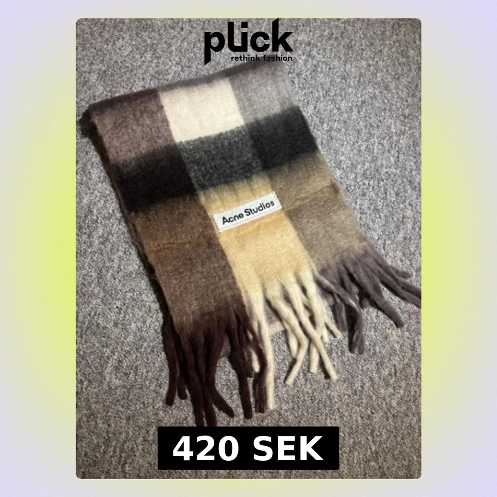 Mjuk och fluffig halsduk från Acne Studios i rutigt mönster med nyanser av beige, brunt, grått och svart. Halsduken har långa fransar i ändarna och en tydlig Acne Studios-logga. Perfekt accessoar för att lyfta din outfit. Kontakta vid frågor om pris eller liknande 😊