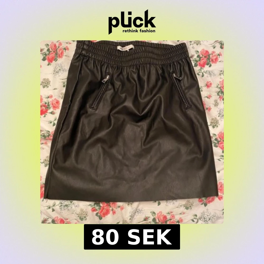 Säljer en svart kjol i skinnimitation med resår i midjan och två sneda fickor med dragkedjor framtill. Kjolen har en enkel och stilren design som passar till många olika outfits.